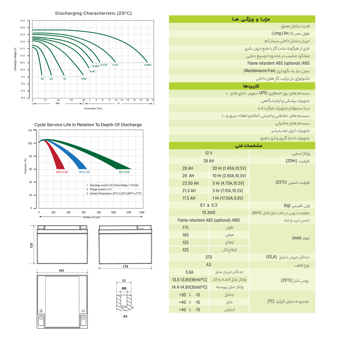 از مزایای و ویژگی های باتری یو پی اس 12 ولت 28 آمپر می توان به قدرت دشارژ عمیق، طول عمر بالا، جریان دشارژ داخلی بسیار کم، عاری از هرگونه نشت گاز یا مایع درون باتری، عملکرد مناسب در محدوده وسیع دمایی، بدون نیاز به تعمیر و نگهداری، تکنولوژی بازترکیب گازهای داخلی و … اشاره کرد.