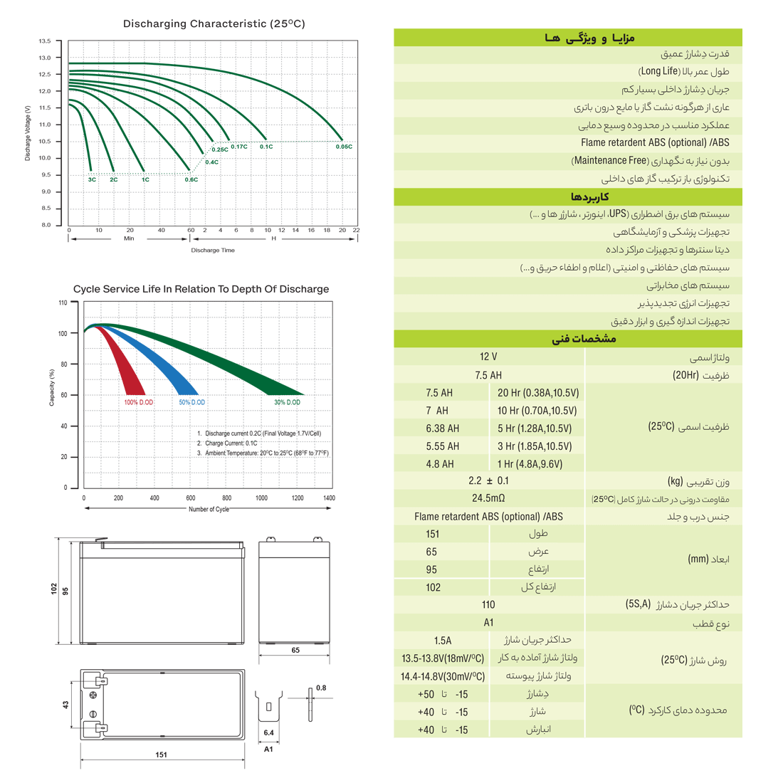 از مزایای و ویژگی های باتری یو پی اس 12 ولت 7.5 آمپر می توان به قدرت دشارژ عمیق، طول عمر بالا، جریان دشارژ داخلی بسیار کم، عاری از هرگونه نشت گاز یا مایع درون باتری، عملکرد مناسب در محدوده وسیع دمایی، بدون نیاز به تعمیر و نگهداری، تکنولوژی بازترکیب گازهای داخلی و … اشاره کرد.